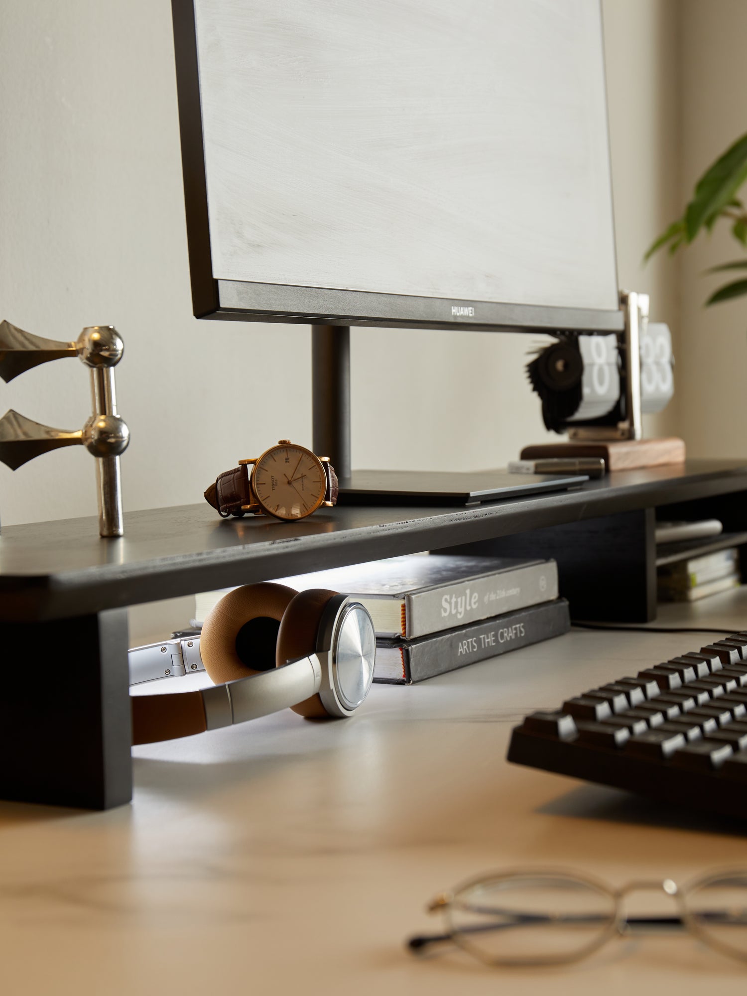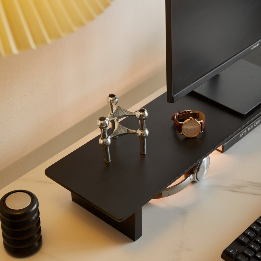 공간의 다른 소품들과 자연스럽게 어우러지는 블랙 액세서리로 우아하고 깔끔한 책상 분위기를 연출하세요. 최대 100kg의 모니터를 지탱할 수 있으며, 견고한 원목 스탠드는 안정감과 기능성을 더합니다.