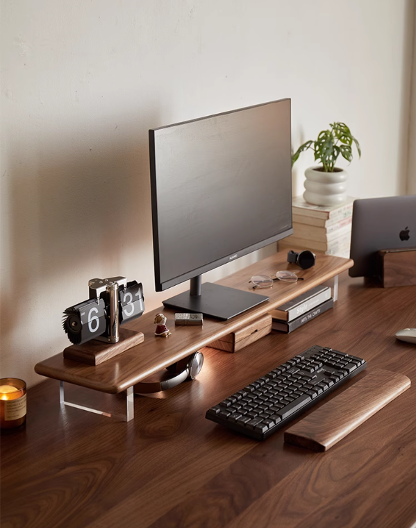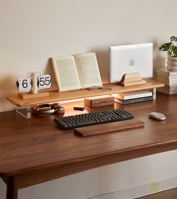 견고한 원목 구조는 뛰어난 내구성과 시대를 초월하는 아름다움을 선사하며, 매끈한 투명 아크릴 스탠드는 마치 공중에 떠 있는 듯한 착시 효과를 선사하여 책상에 모던한 미니멀리즘과 시각적인 가벼움을 더합니다. 좋아하는 책, 식물, 또는 장식용품을 진열하기에 완벽한 이 선반은 세련되고 스타일리시한 분위기를 연출하는 중심점을 만들어줍니다.