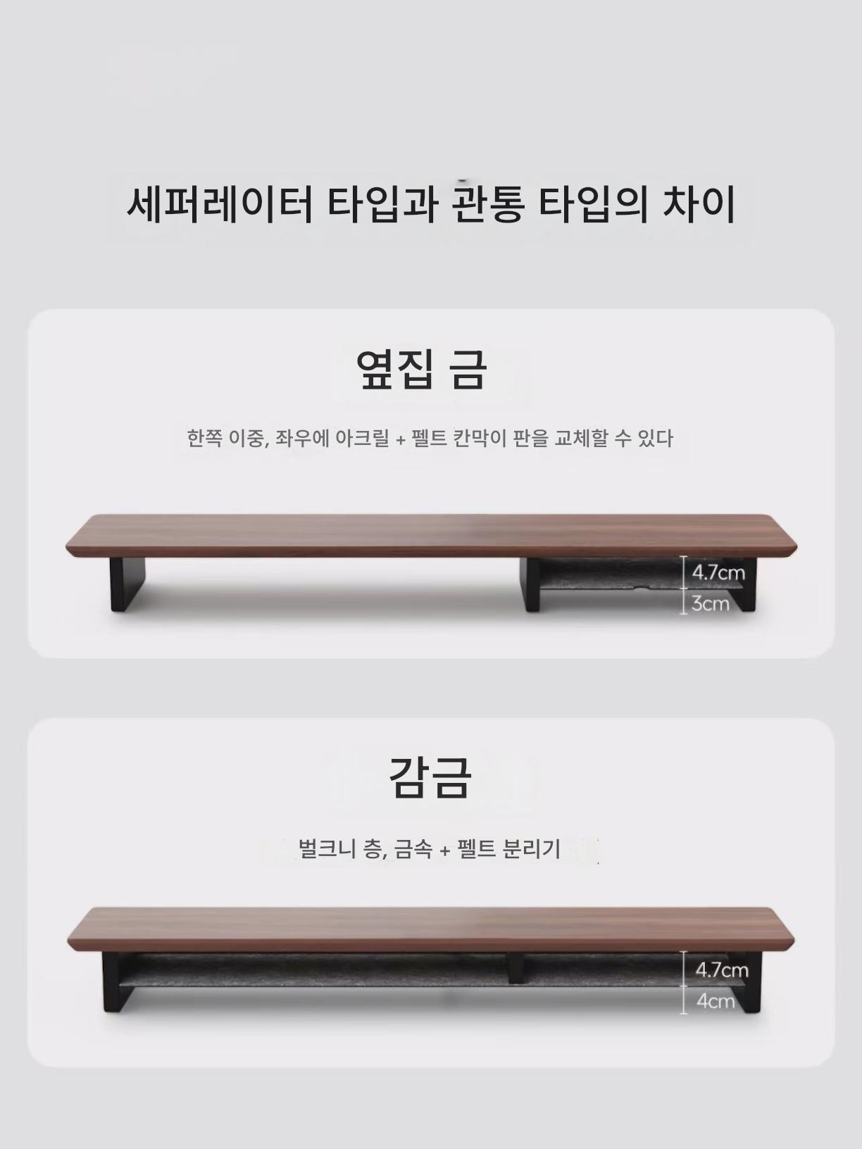 칸막이 스타일: 이 스탠드는 한쪽 면에만 이중 트레이가 있습니다(트레이는 분리하여 왼쪽 또는 오른쪽에 장착할 수 있습니다). 칸막이는 조절 가능한 펠트 소재로 제작되어 선반 배치를 원하는 대로 조절할 수 있습니다.