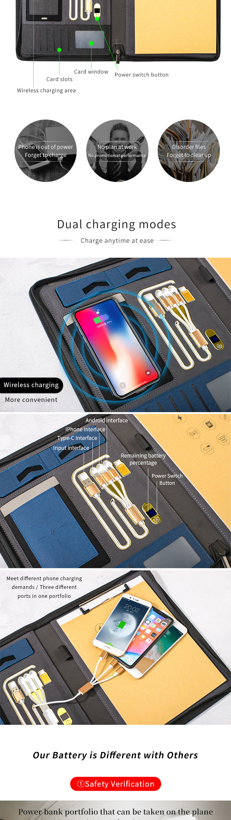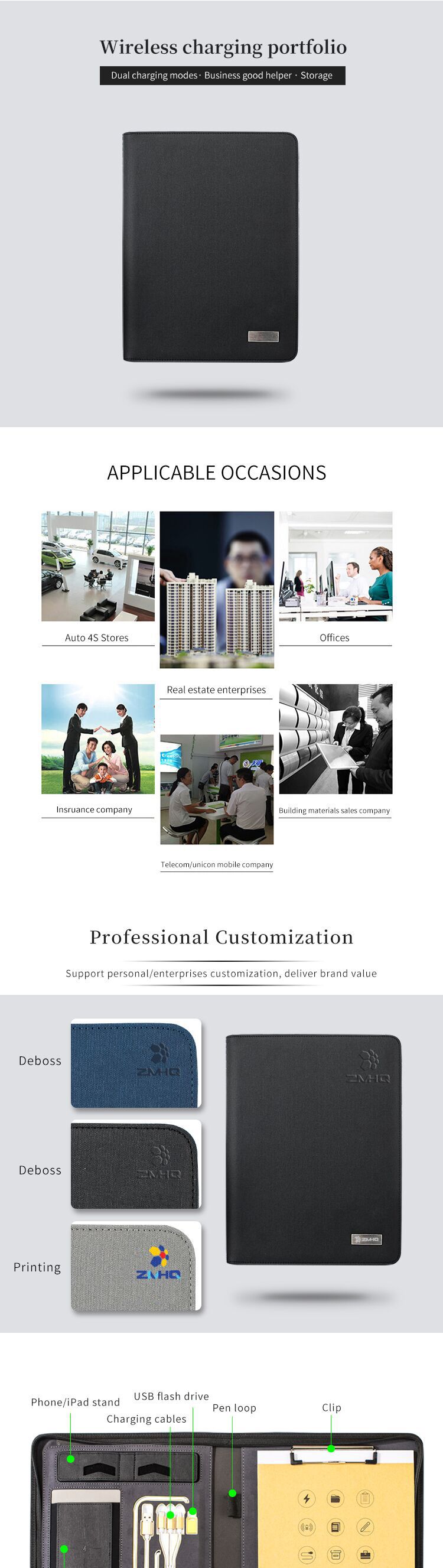 다재다능한 무선 충전 패드폴리오 폴더로 당신의 전문적인 이미지를 더욱 돋보이게 하세요. 이 A4 다기능 가죽 서류 가방은 무선 충전 기능과 USB Type-A, USB Type-C, Micro USB 등 다양한 충전 인터페이스를 갖추고 있어 휴대폰, 태블릿 등 다양한 전자 기기에 적합합니다. 학생, 직장인, 사업가 모두에게 안성맞춤입니다. 어떤 옷차림에도 잘 어울리는 세련된 디자인으로 어떤 상황에도 잘 어울립니다.