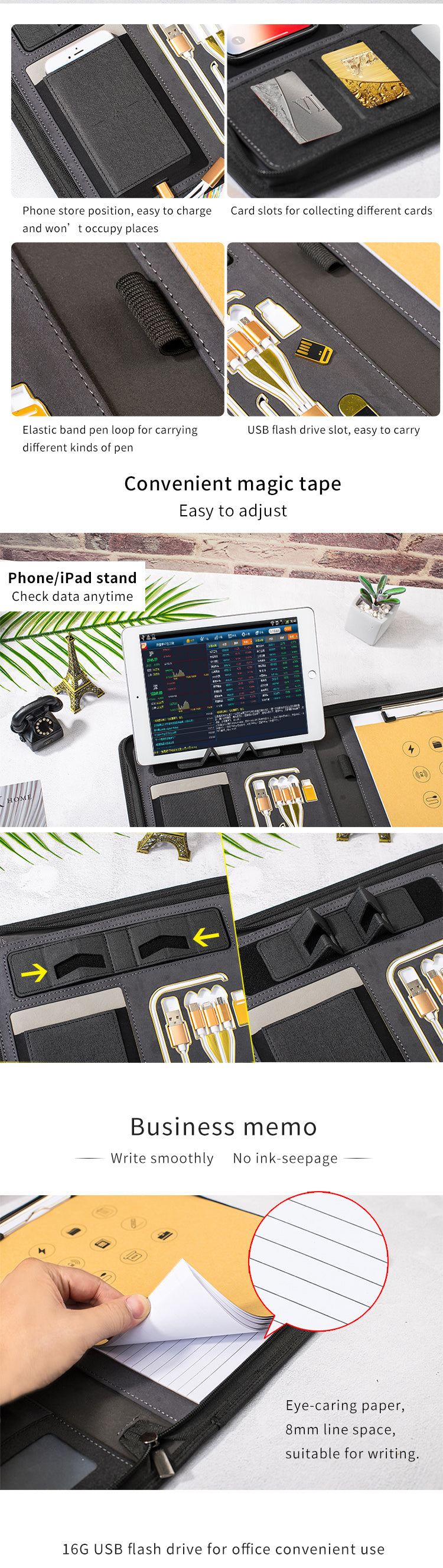 휴대폰과 태블릿 거치대가 있어 편리하게 사용할 수 있도록 설계된 무선 충전 패드폴리오 폴더를 소개합니다. 강화된 매직 본딩과 보이지 않는 접이식 구조로 일상생활에 필요한 내구성을 제공합니다. 탈착식 다용도 모바일 보드 클램프와 넉넉한 A4 용지 수납공간을 갖춘 이 패드폴리오는 필요한 모든 물품을 효율적으로 정리할 수 있도록 도와줍니다.