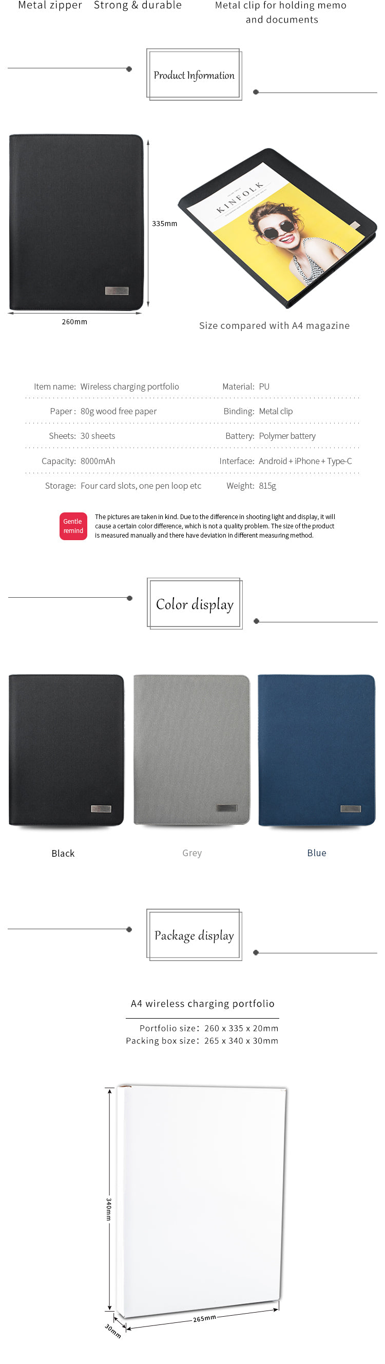 나만의 특별한 감성을 원하시나요? A4 비즈니스 다기능 무선 충전 패드폴리오 매니저에 회사 로고나 독특한 디자인을 추가할 수 있는 맞춤 제작 옵션을 제공하여 기업 선물이나 홍보용으로 완벽한 아이템이 될 것입니다. 더 자세한 내용은 문의해 주시고 , 이 기능적이고 스타일리시한 액세서리로 브랜드 이미지를 더욱 돋보이게 하세요.